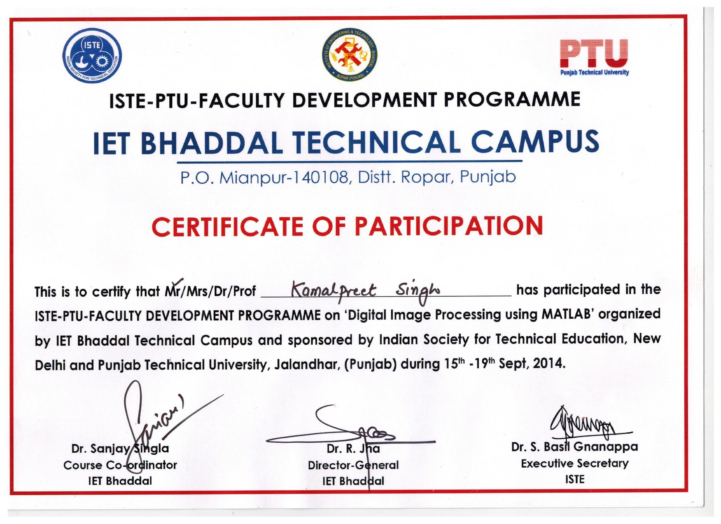 Faculty Development Programme Course: *Digital Image Processing using MATLAB* Institution: ISTE / Punjab Technical University Year: 2014