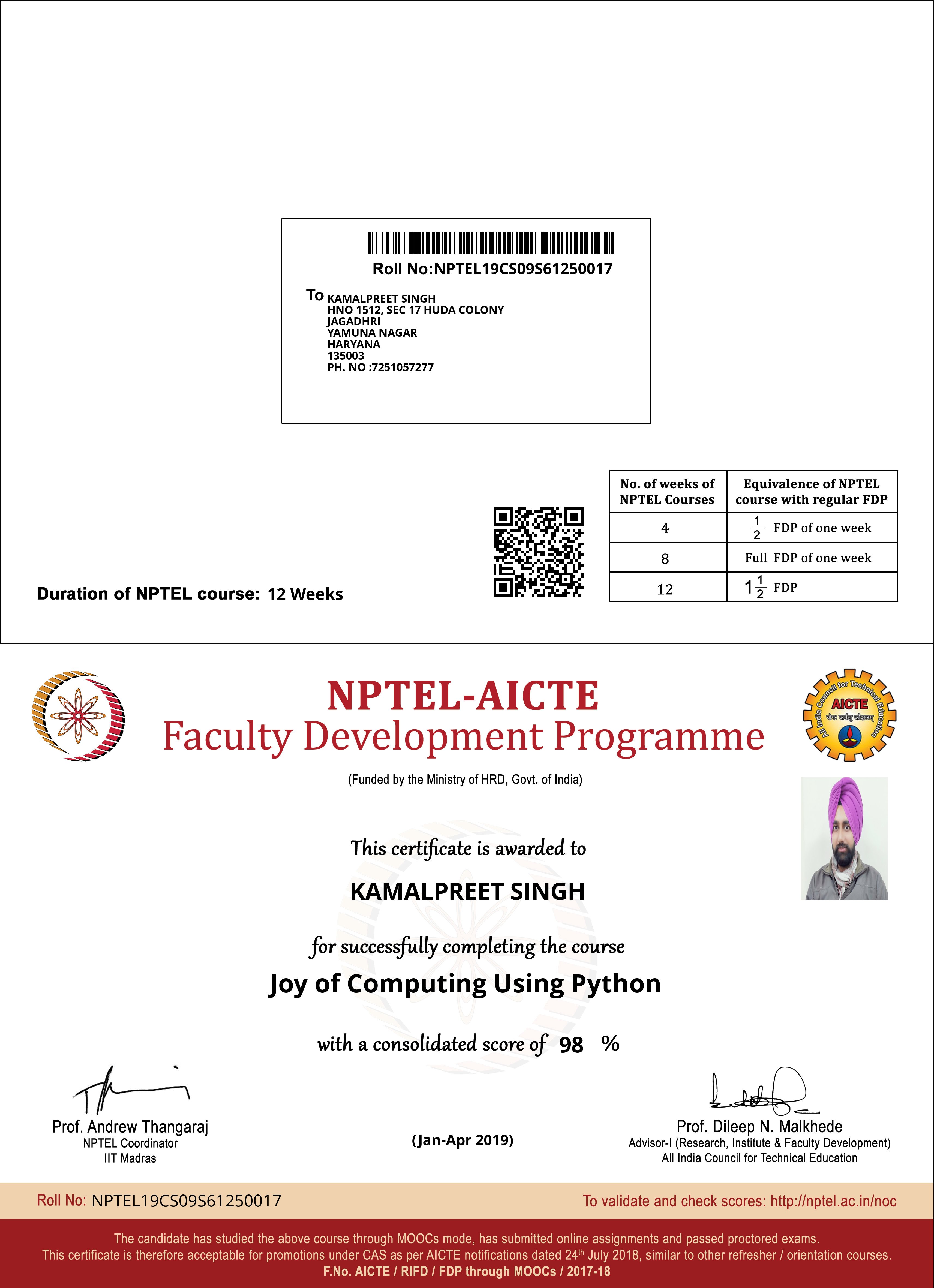 NPTEL-AICTE Faculty Development Programme Course: *Joy of Computing Using Python* Institution: IIT Madras Year: 2019 Score: **98% (Elite + Top 1%)**
