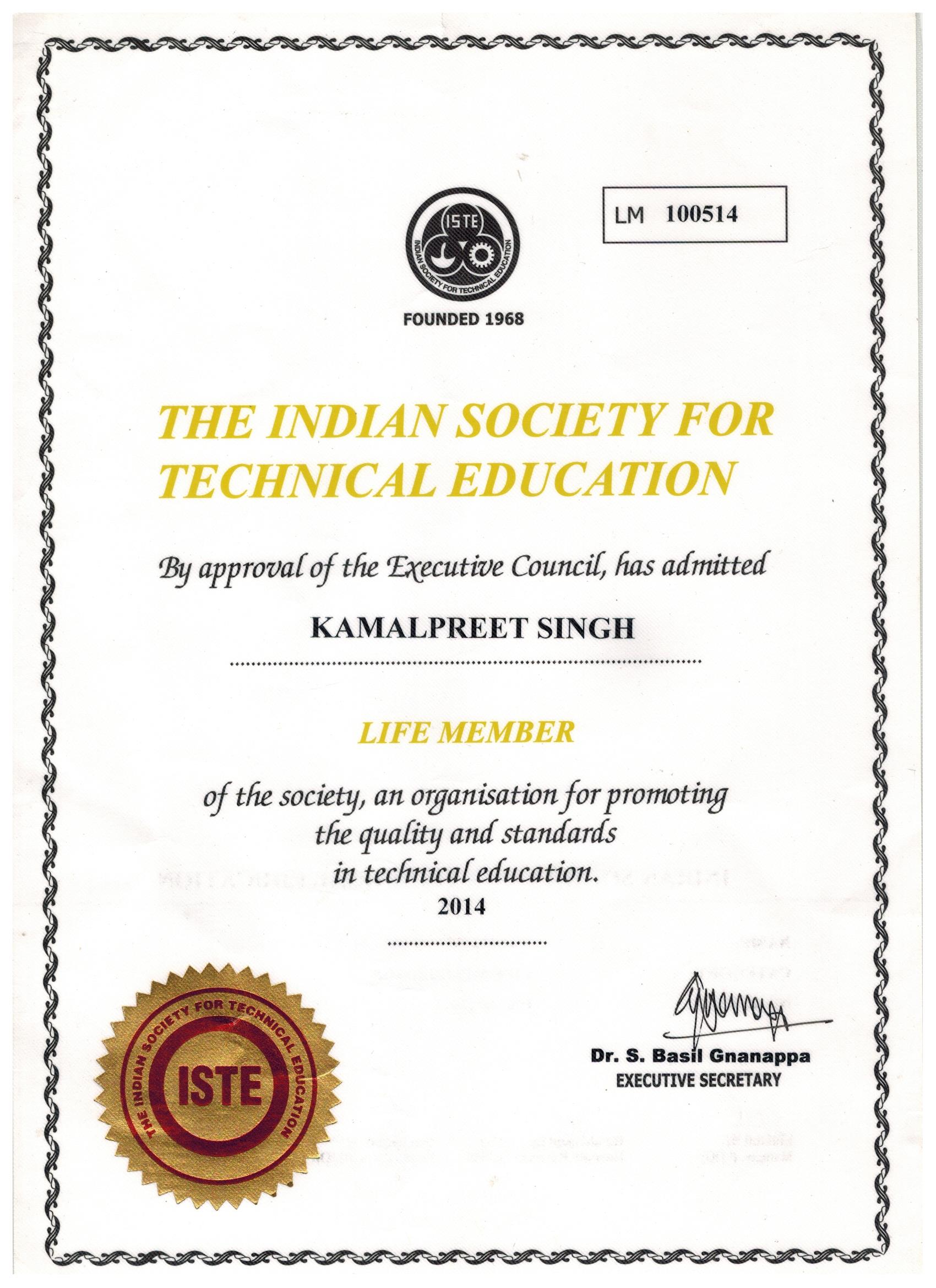 Life Member Indian Society for Technical Education (ISTE) ISTE is a national professional body dedicated to the advancement of engineering and technical education in India through faculty development, curriculum innovation, and academic collaboration. Membership signifies commitment to quality teaching, professional development, and academic collaboration in technical education.Academic & Professional Engagement